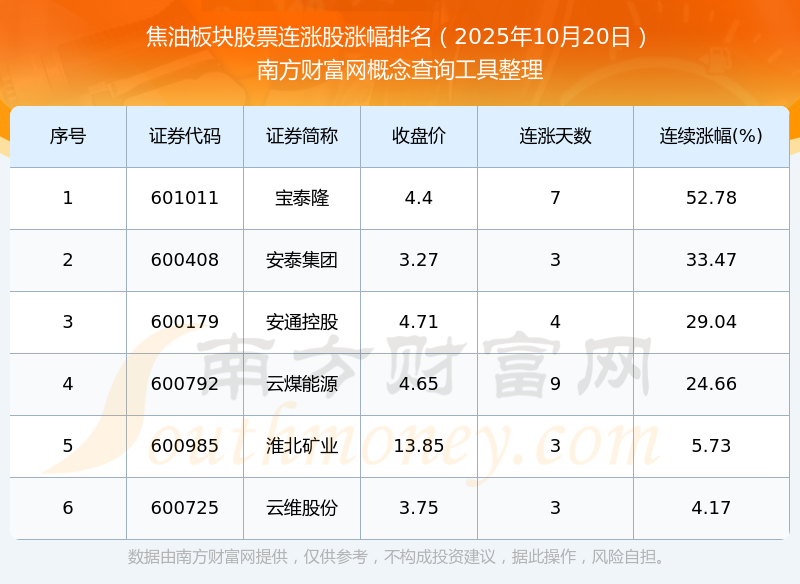 2025年10月20日焦油板塊股票連漲股漲幅排名