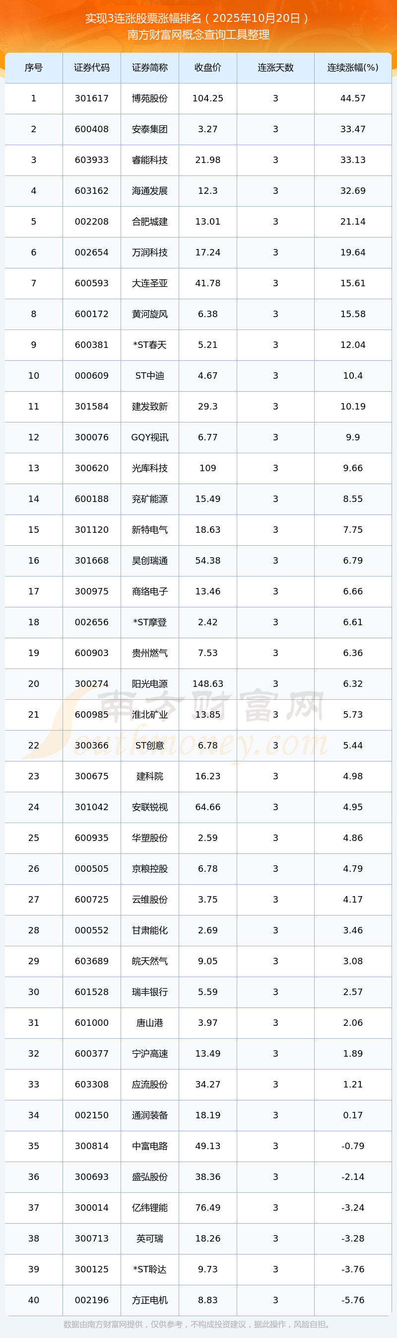 2025年10月20日股市行情:40只個(gè)股實(shí)現(xiàn)3連漲