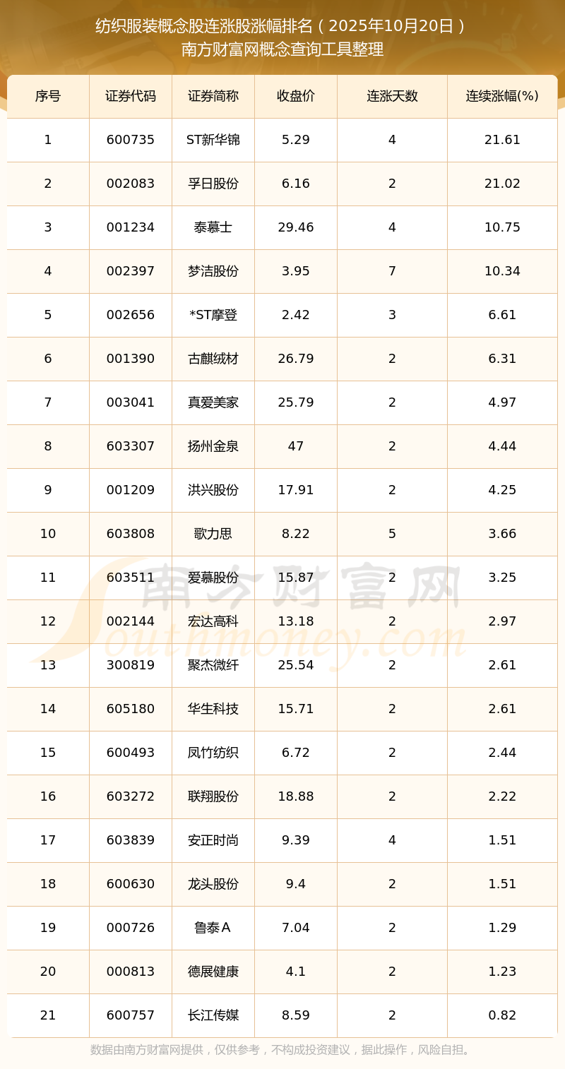 2025年10月20日紡織服裝概念股連漲股漲幅排名