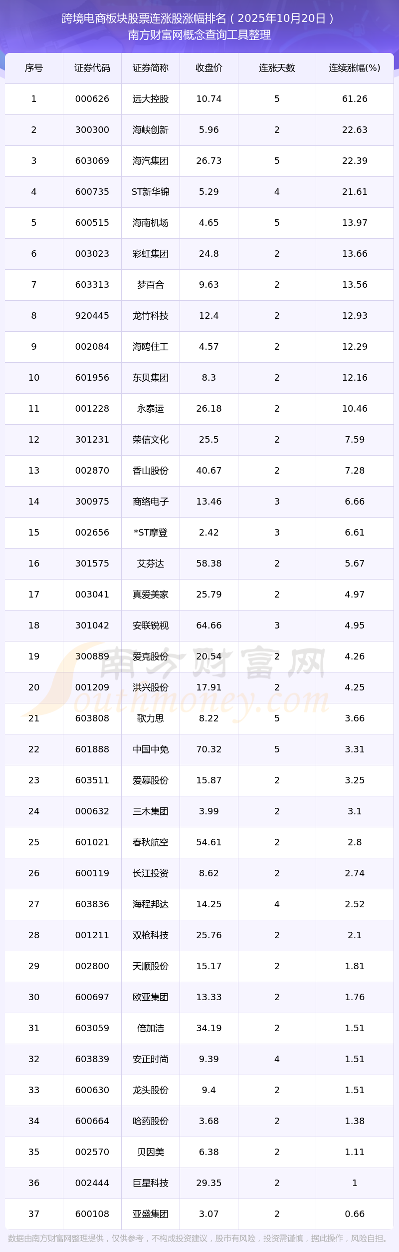 2025年10月20日跨境電商板塊股票連漲股漲幅排名