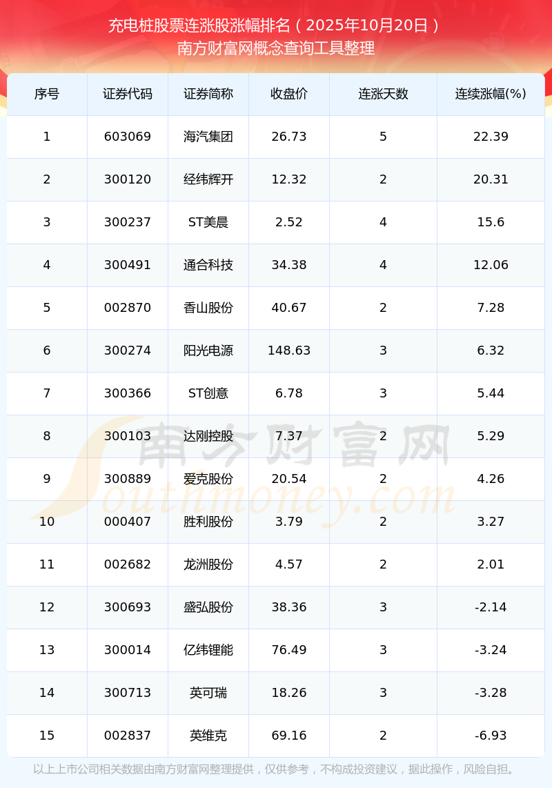根據(jù)南方財(cái)富網(wǎng)概念查詢工具數(shù)據(jù)統(tǒng)計(jì),截止2025年10月20日收盤(pán),充電樁股票共有15只個(gè)股實(shí)現(xiàn)連漲。其中連續(xù)漲幅較大的個(gè)股有海汽集團(tuán)、經(jīng)緯輝開(kāi)、ST美晨等,連續(xù)漲幅分別為22.39%、20.31%、15.60%。