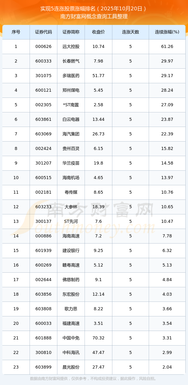 根據(jù)南方財(cái)富網(wǎng)概念查詢工具數(shù)據(jù)統(tǒng)計(jì),截止2025年10月20日收盤(pán),共有23只個(gè)股實(shí)現(xiàn)5天連漲。其中連續(xù)漲幅較大的個(gè)股有遠(yuǎn)大控股、長(zhǎng)春燃?xì)狻⒍嗳疳t(yī)藥等,連續(xù)漲幅分別為61.26%、29.97%、29.17%。