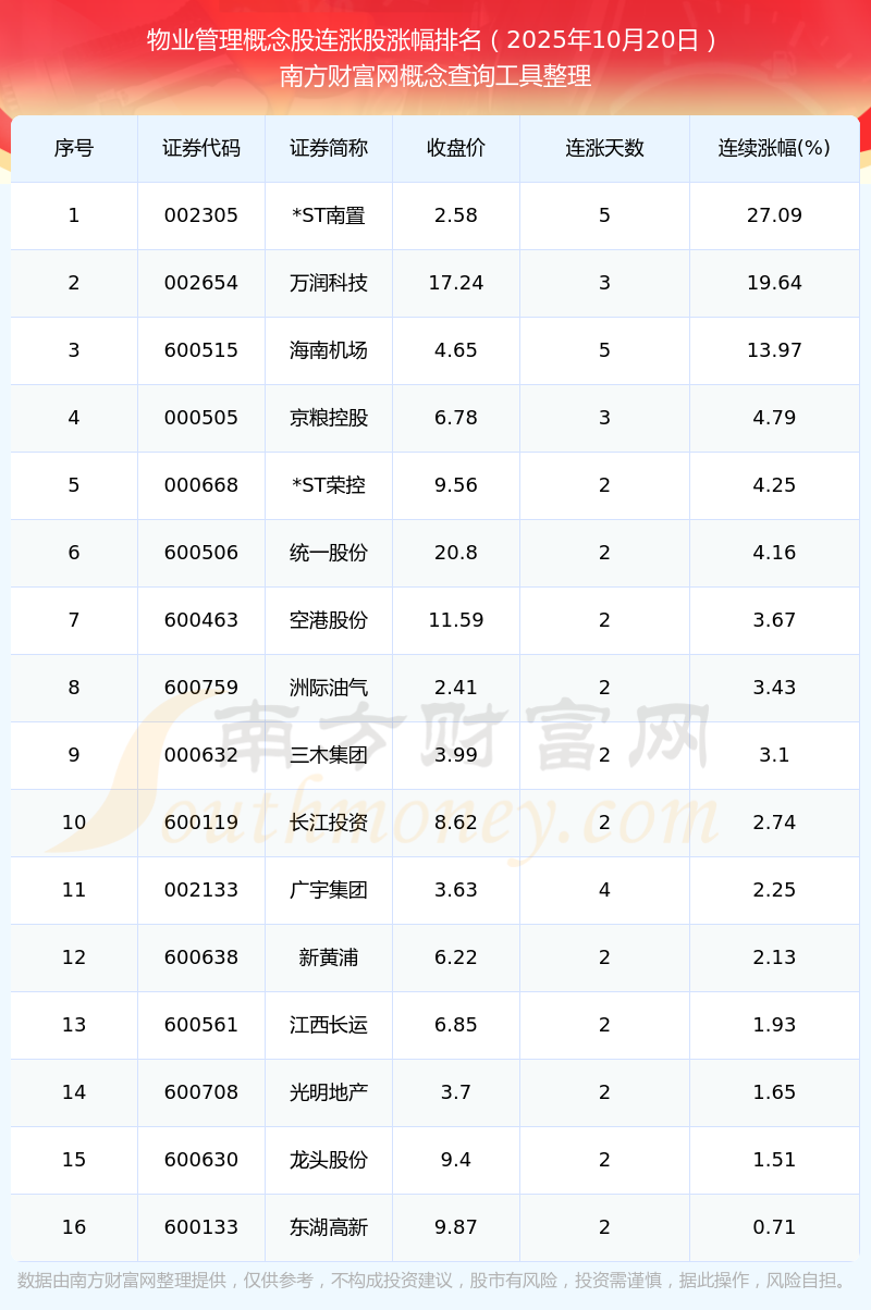 根據(jù)南方財(cái)富網(wǎng)概念查詢工具數(shù)據(jù)統(tǒng)計(jì),截止2025年10月20日收盤,物業(yè)管理概念股共有16只個(gè)股實(shí)現(xiàn)連漲。其中連續(xù)漲幅較大的個(gè)股有*ST南置、萬潤科技、海南機(jī)場等,連續(xù)漲幅分別為27.09%、19.64%、13.97%。