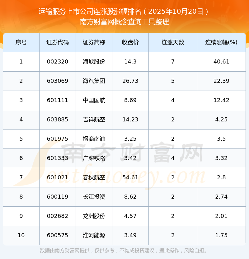 2025年10月20日運(yùn)輸服務(wù)上市公司連漲股漲幅排名