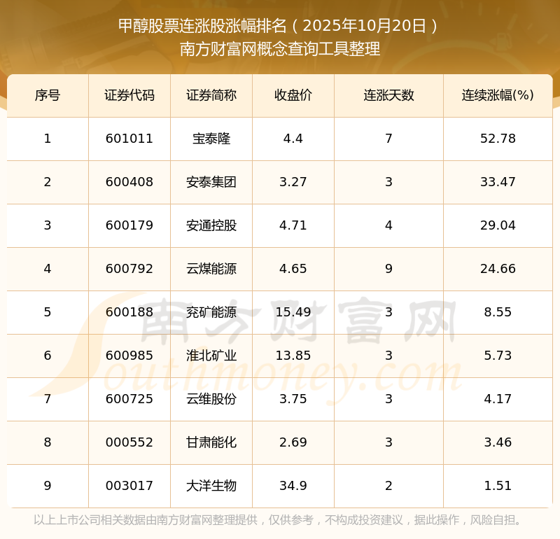 根據(jù)南方財富網(wǎng)概念查詢工具數(shù)據(jù)統(tǒng)計,截止2025年10月20日收盤,甲醇股票共有9只個股實現(xiàn)連漲。其中連續(xù)漲幅較大的個股有寶泰隆、安泰集團、安通控股等,連續(xù)漲幅分別為52.78%、33.47%、29.04%。