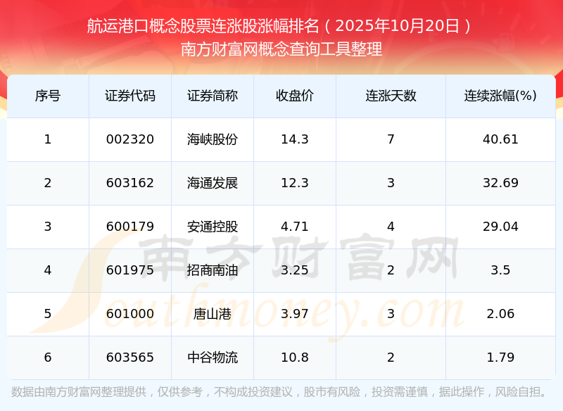 2025年10月20日航運港口概念股票連漲股漲幅排名