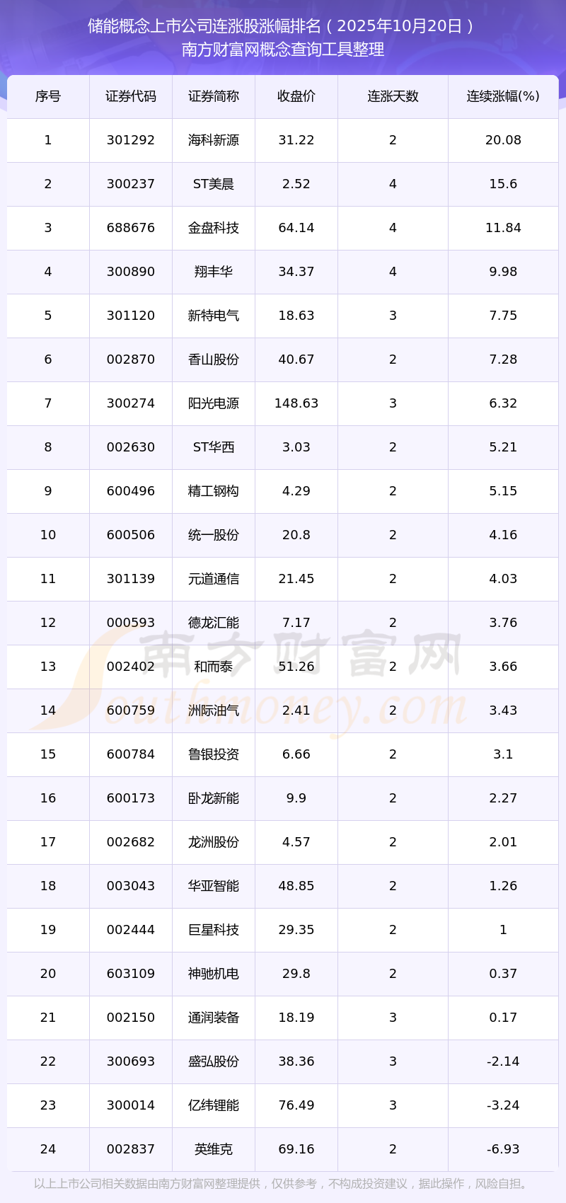 2025年10月20日儲能概念上市公司連漲股漲幅排名