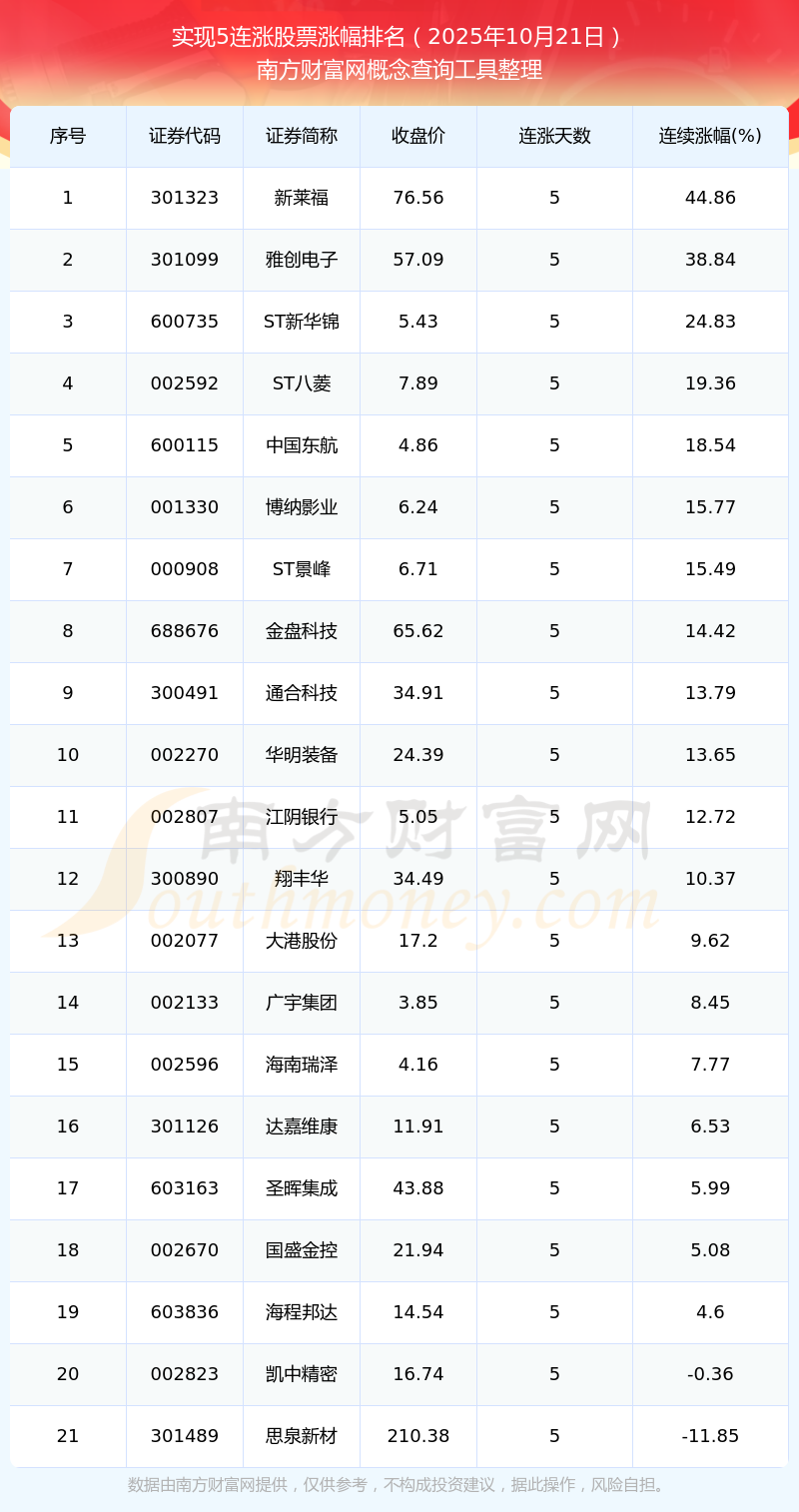 2025年10月21日實(shí)現(xiàn)5連漲股票漲幅排名
