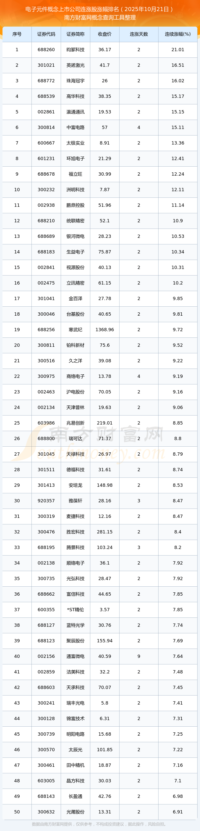 2025年10月21日電子元件概念上市公司連漲股漲幅排名