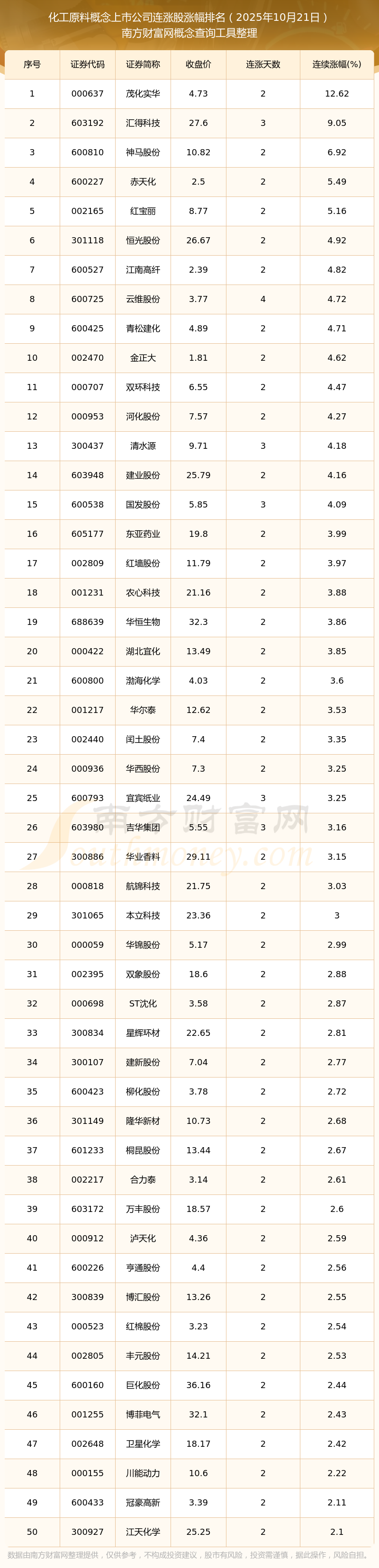 2025年10月21日化工原料概念上市公司連漲股漲幅排名