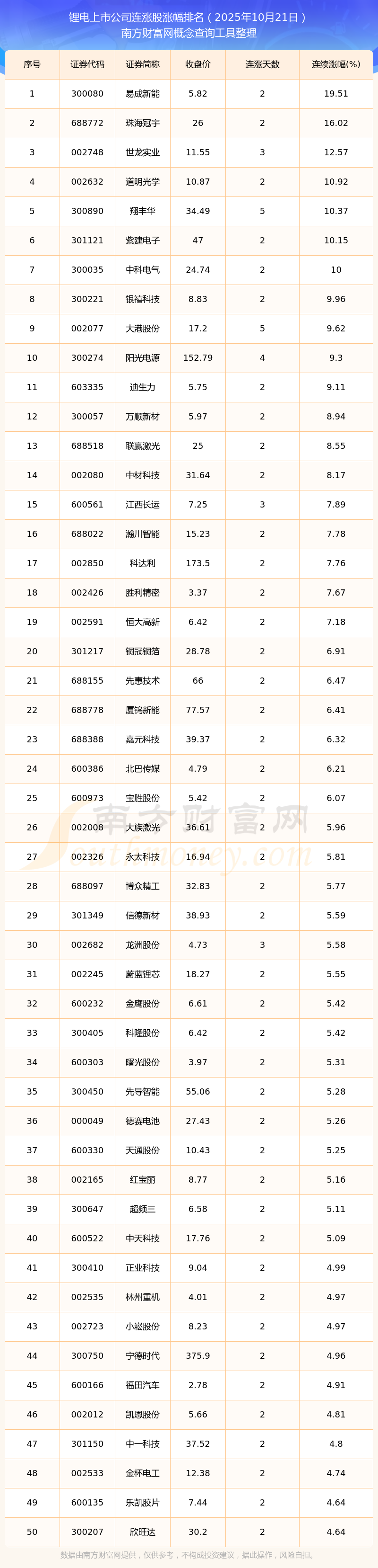 2025年10月21日鋰電上市公司連漲股票漲幅排名