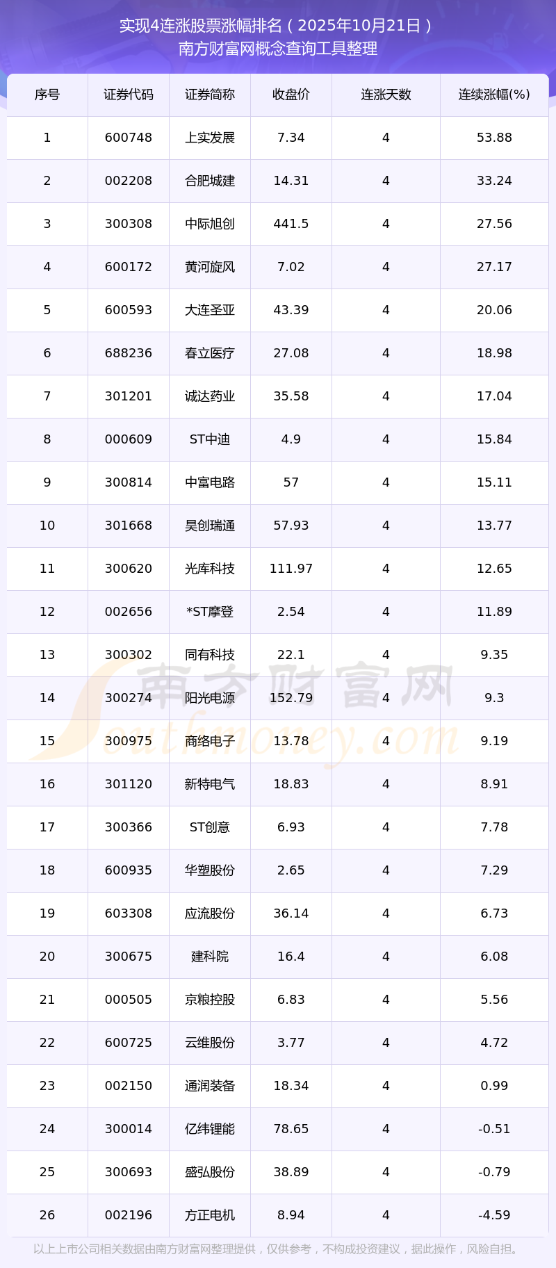 2025年10月21日實現(xiàn)4連漲股票漲幅排名