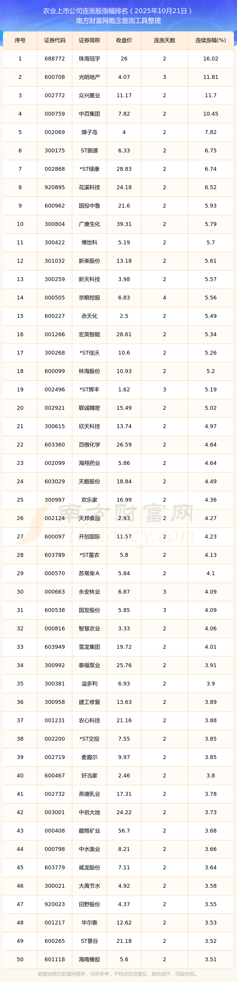 2025年10月21日農(nóng)業(yè)上市公司連漲股漲幅排名