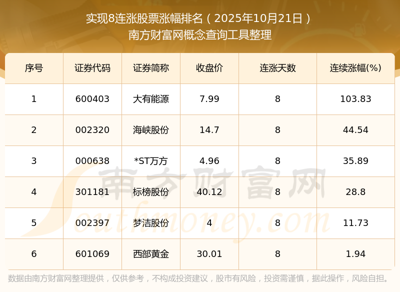 根據(jù)南方財(cái)富網(wǎng)概念查詢工具數(shù)據(jù)統(tǒng)計(jì),截止2025年10月21日收盤,共有6只個(gè)股實(shí)現(xiàn)8天連漲。其中連續(xù)漲幅較大的個(gè)股有大有能源、海峽股份、*ST萬方等,連續(xù)漲幅分別為103.83%、44.54%、35.89%。