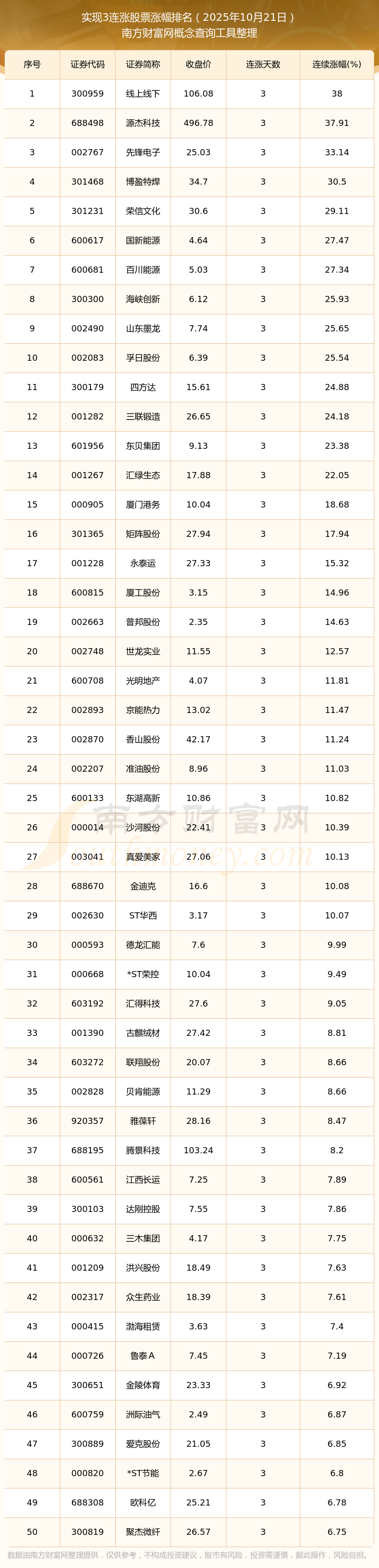 2025年10月21日實(shí)現(xiàn)3連漲股票漲幅排名