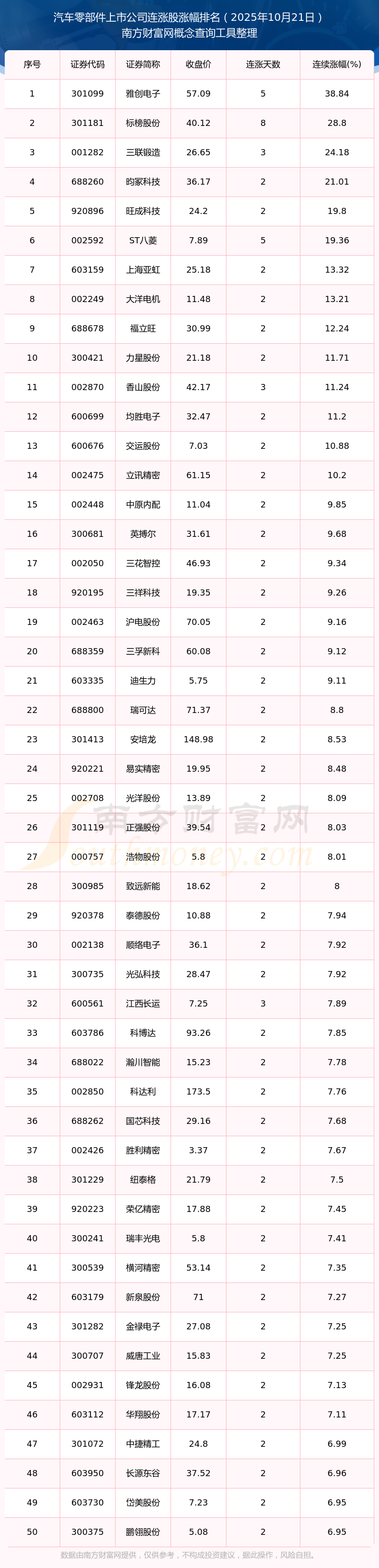 2025年10月21日汽車零部件上市公司連漲股漲幅排名