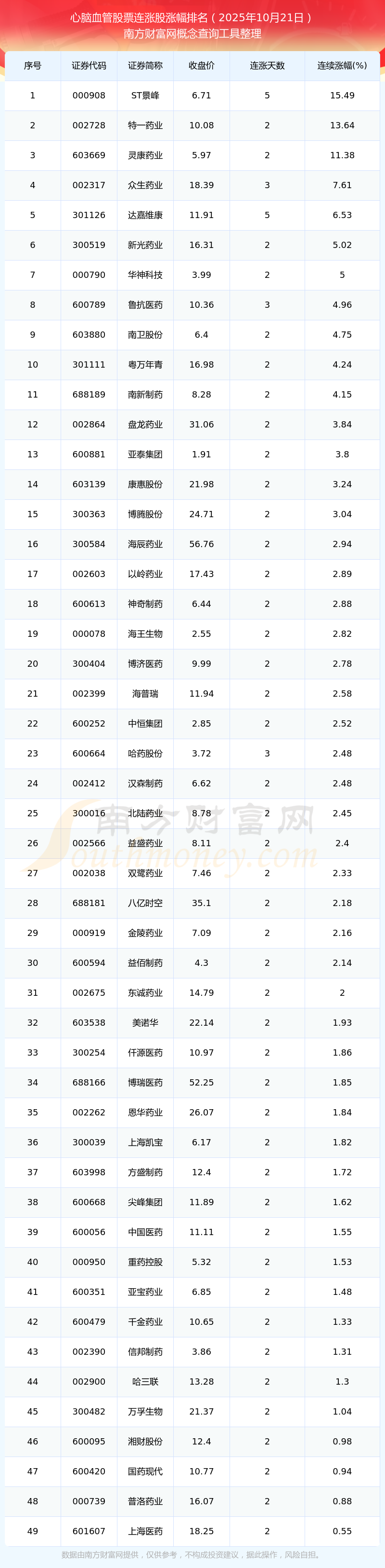 2025年10月21日心腦血管股票連漲股票漲幅排名