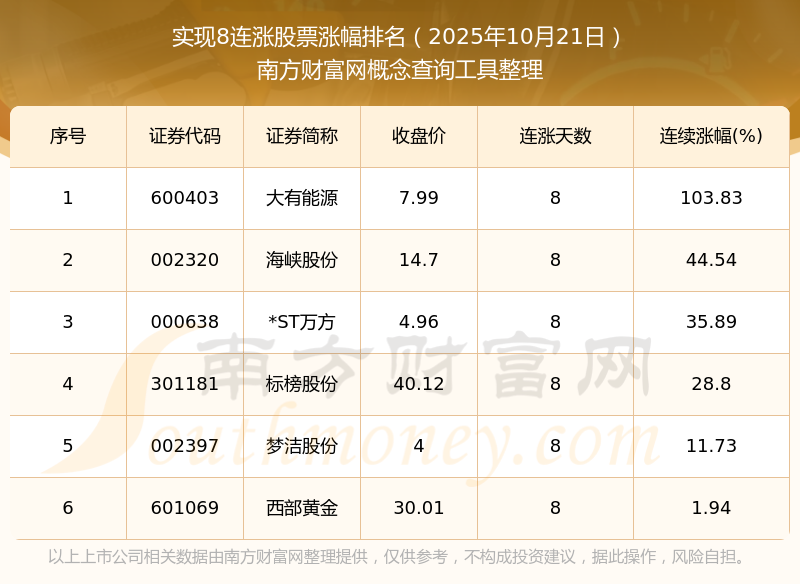 根據(jù)南方財(cái)富網(wǎng)概念查詢(xún)工具數(shù)據(jù)統(tǒng)計(jì),截止2025年10月21日收盤(pán),共有6只個(gè)股實(shí)現(xiàn)8天連漲。其中連續(xù)漲幅較大的個(gè)股有大有能源、海峽股份、*ST萬(wàn)方等,連續(xù)漲幅分別為103.83%、44.54%、35.89%。