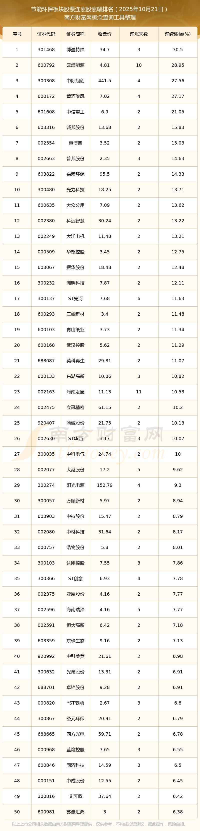 2025年10月21日節(jié)能環(huán)保板塊股票連漲股漲幅排名