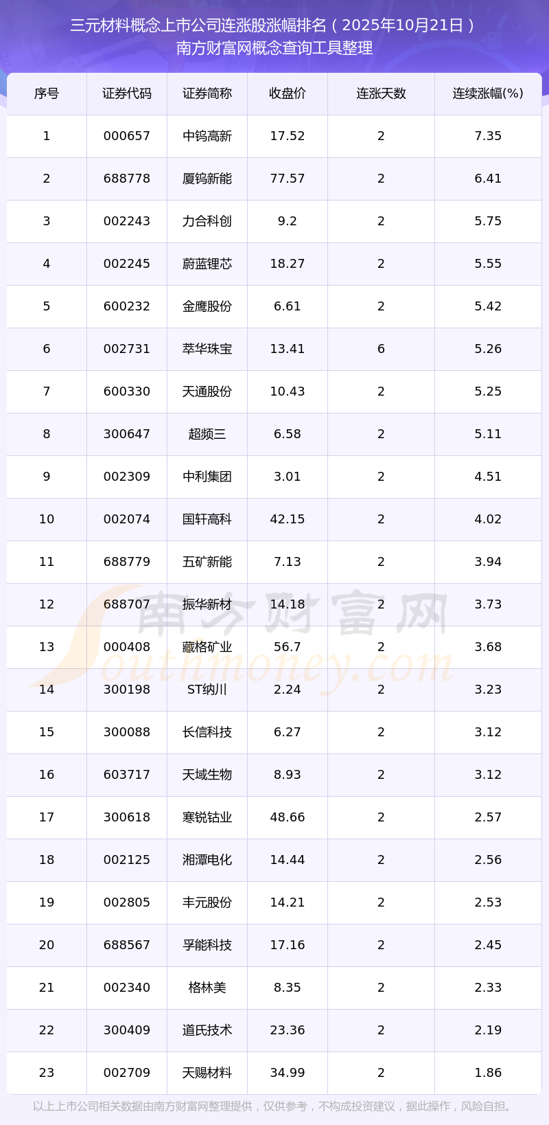 2025年10月21日三元材料概念上市公司連漲股漲幅排名