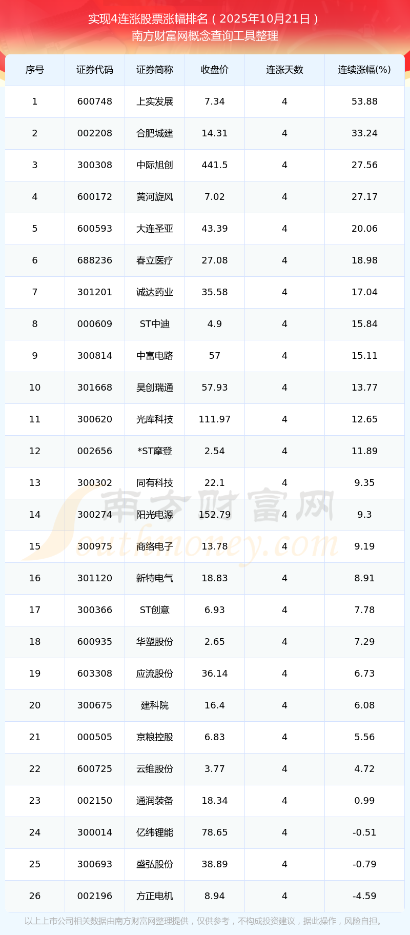 根據(jù)南方財富網(wǎng)概念查詢工具數(shù)據(jù)統(tǒng)計,截止2025年10月21日收盤,共有26只個股實(shí)現(xiàn)4天連漲。其中連續(xù)漲幅較大的個股有上實(shí)發(fā)展、合肥城建、中際旭創(chuàng)等,連續(xù)漲幅分別為53.88%、33.24%、27.56%。