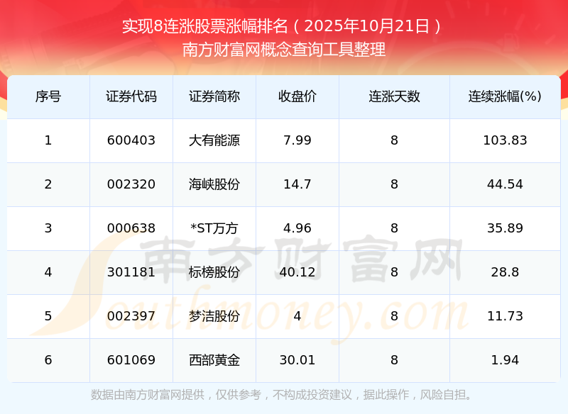 根據(jù)南方財(cái)富網(wǎng)概念查詢工具數(shù)據(jù)統(tǒng)計(jì),截止2025年10月21日收盤,共有6只個(gè)股實(shí)現(xiàn)8天連漲。其中連續(xù)漲幅較大的個(gè)股有大有能源、海峽股份、*ST萬(wàn)方等,連續(xù)漲幅分別為103.83%、44.54%、35.89%。