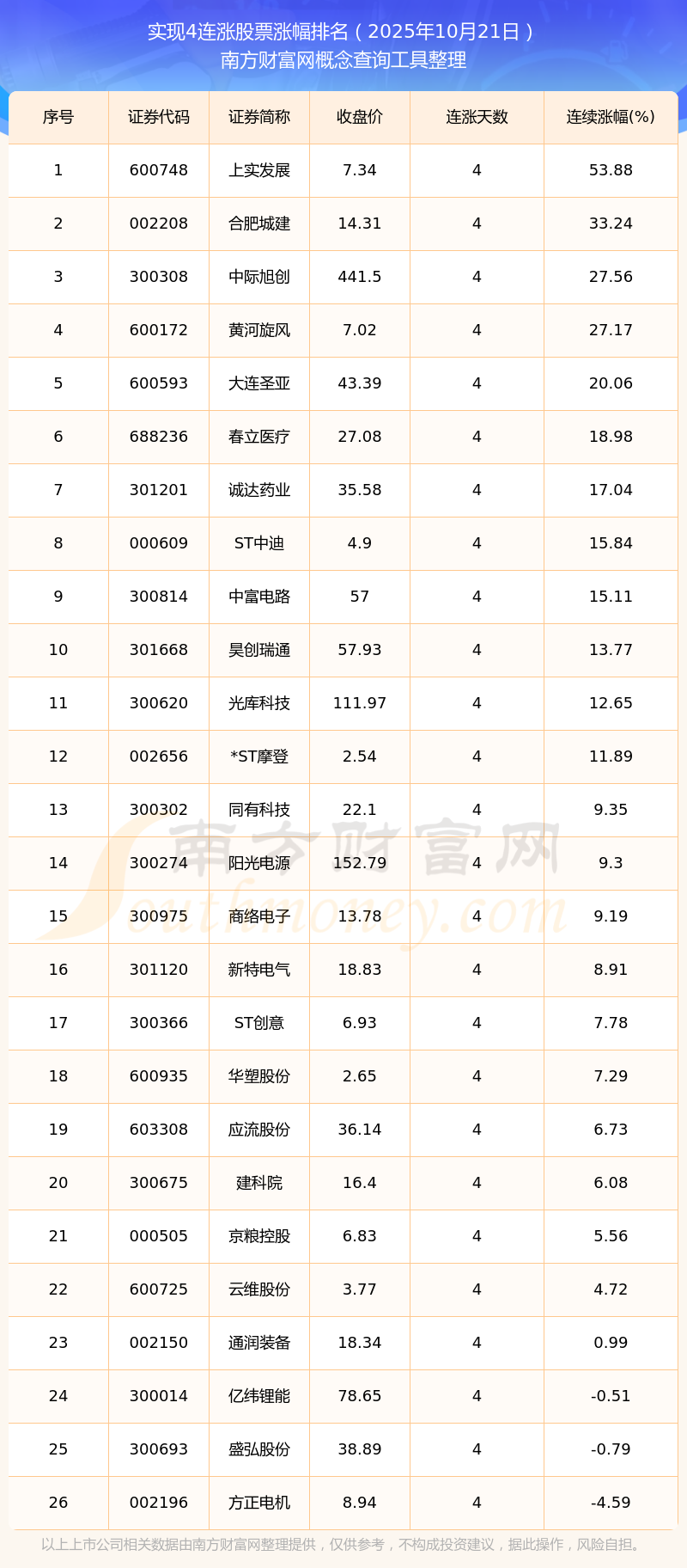根據(jù)南方財(cái)富網(wǎng)概念查詢工具數(shù)據(jù)統(tǒng)計(jì),截止2025年10月21日收盤(pán),共有26只個(gè)股實(shí)現(xiàn)4天連漲。其中連續(xù)漲幅較大的個(gè)股有上實(shí)發(fā)展、合肥城建、中際旭創(chuàng)等,連續(xù)漲幅分別為53.88%、33.24%、27.56%。