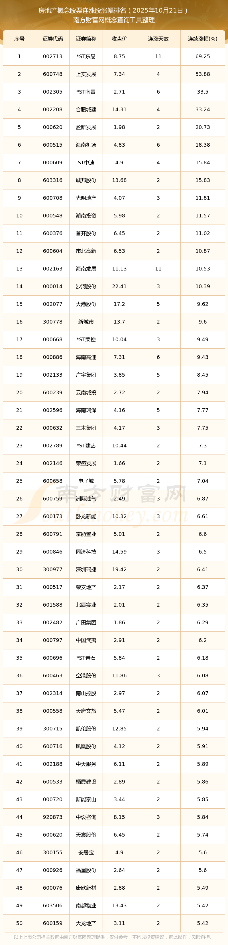 2025年10月21日房地產(chǎn)概念股票連漲股票漲幅排名