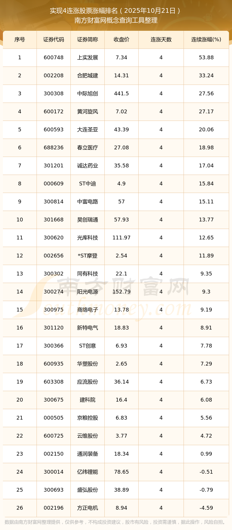 2025年10月21日實(shí)現(xiàn)4連漲股票漲幅排名