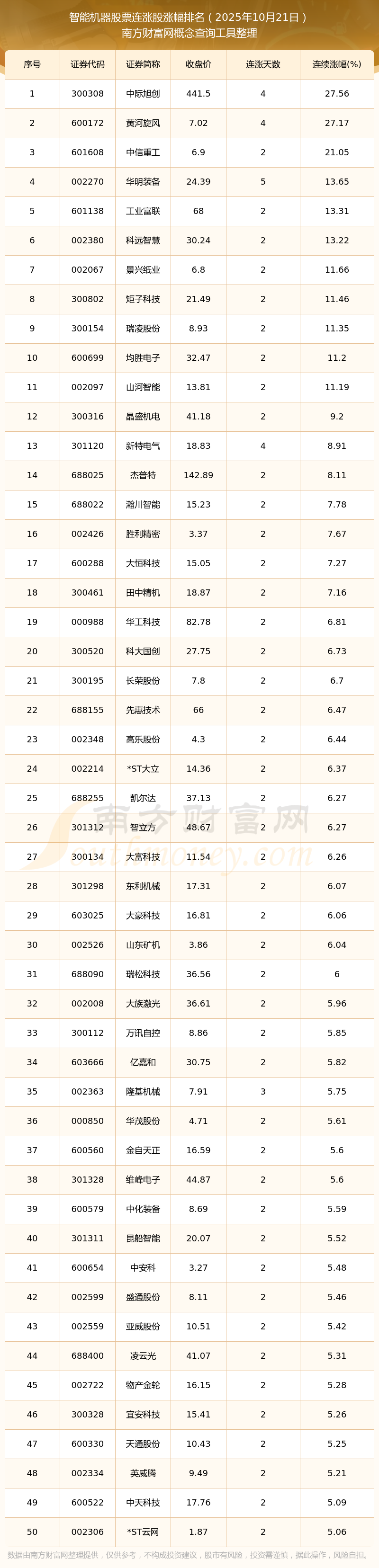 2025年10月21日智能機器股票連漲股票漲幅排名