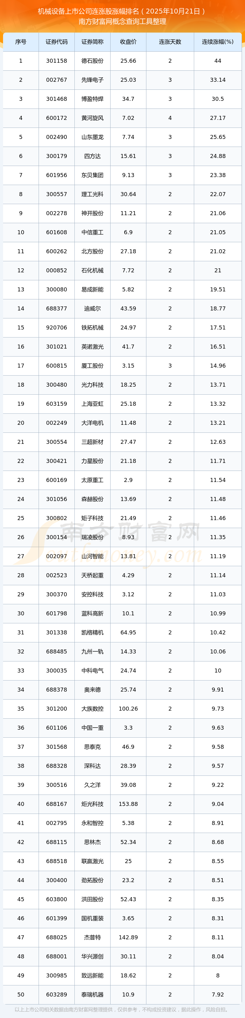 2025年10月21日機(jī)械設(shè)備上市公司連漲股漲幅排名