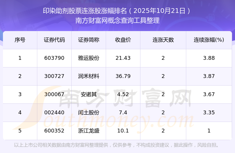 2025年10月21日印染助劑股票連漲股漲幅排名