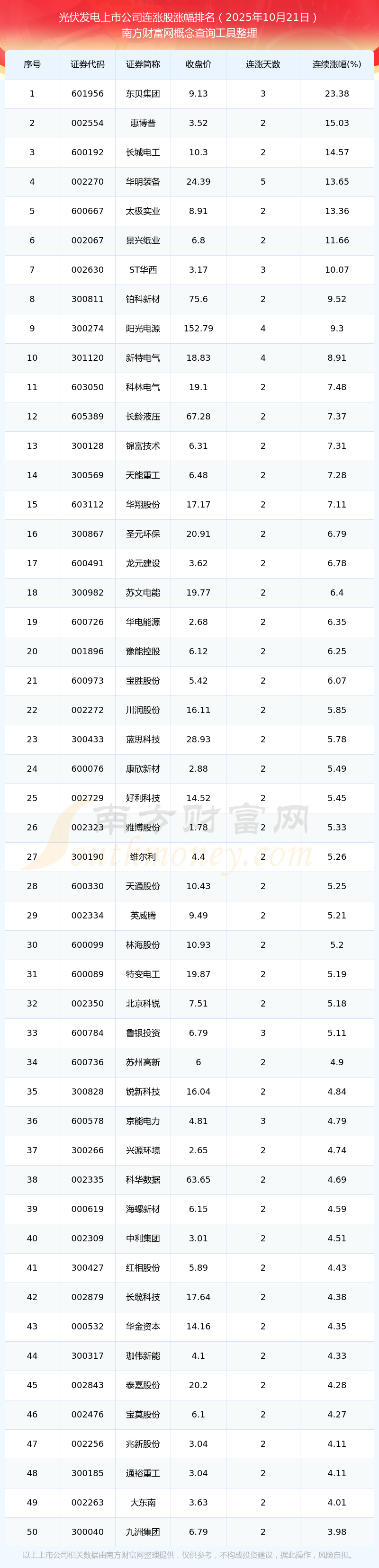 2025年10月21日光伏發(fā)電上市公司連漲股漲幅排名