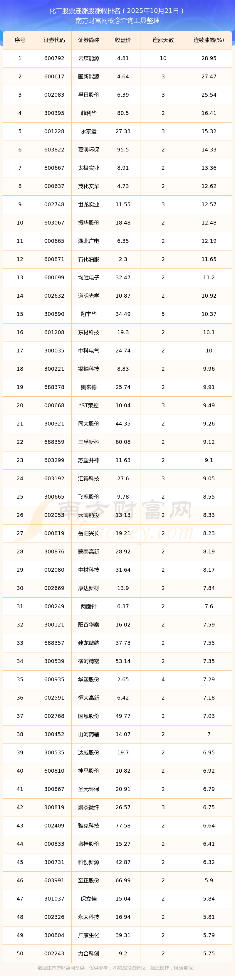 根據(jù)南方財富網(wǎng)概念查詢工具數(shù)據(jù)統(tǒng)計,截止2025年10月21日收盤,化工股票共有364只個股實現(xiàn)連漲。其中連續(xù)漲幅較大的個股有云煤能源、國新能源、孚日股份等,連續(xù)漲幅分別為28.95%、27.47%、25.54%。