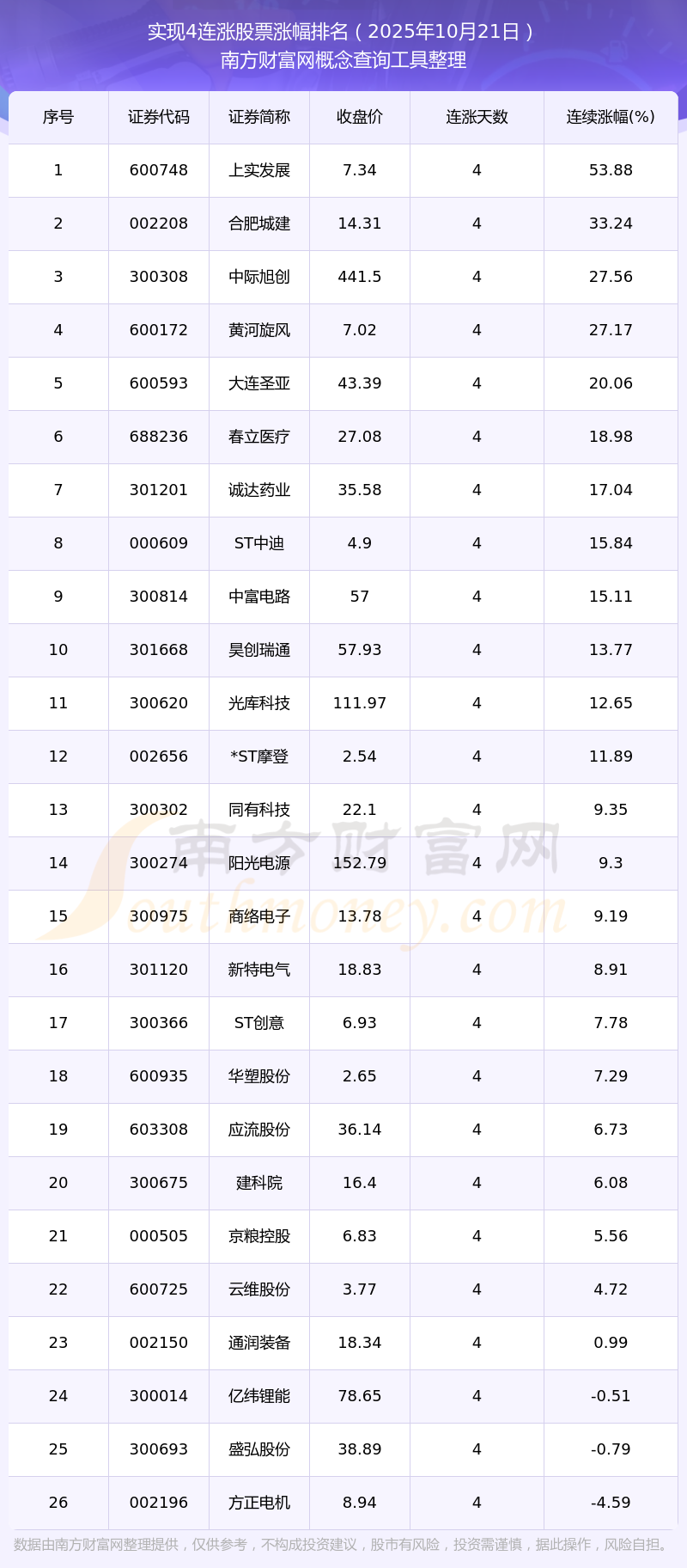 根據(jù)南方財(cái)富網(wǎng)概念查詢工具數(shù)據(jù)統(tǒng)計(jì),截止2025年10月21日收盤,共有26只個(gè)股實(shí)現(xiàn)4天連漲。其中連續(xù)漲幅較大的個(gè)股有上實(shí)發(fā)展、合肥城建、中際旭創(chuàng)等,連續(xù)漲幅分別為53.88%、33.24%、27.56%。