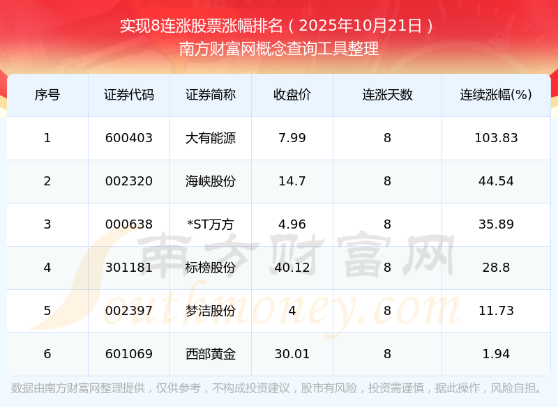 根據(jù)南方財(cái)富網(wǎng)概念查詢(xún)工具數(shù)據(jù)統(tǒng)計(jì),截止2025年10月21日收盤(pán),共有6只個(gè)股實(shí)現(xiàn)8天連漲。其中連續(xù)漲幅較大的個(gè)股有大有能源、海峽股份、*ST萬(wàn)方等,連續(xù)漲幅分別為103.83%、44.54%、35.89%。