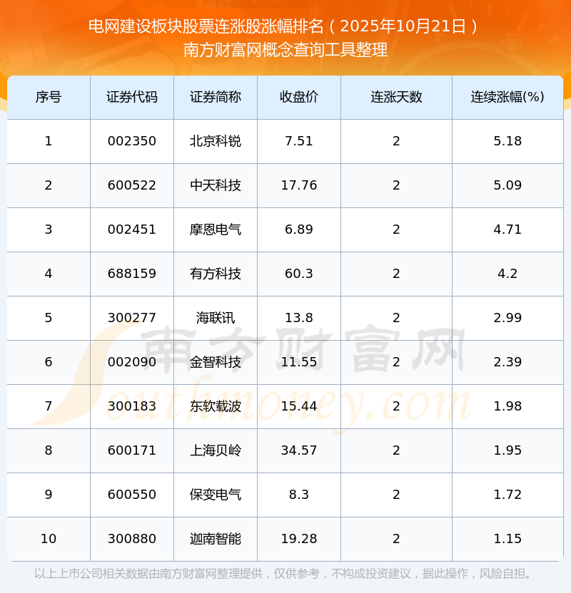 2025年10月21日電網(wǎng)建設(shè)板塊股票連漲股漲幅排名