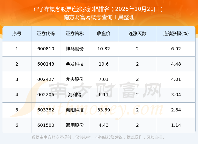 2025年10月21日簾子布概念股票連漲股漲幅排名