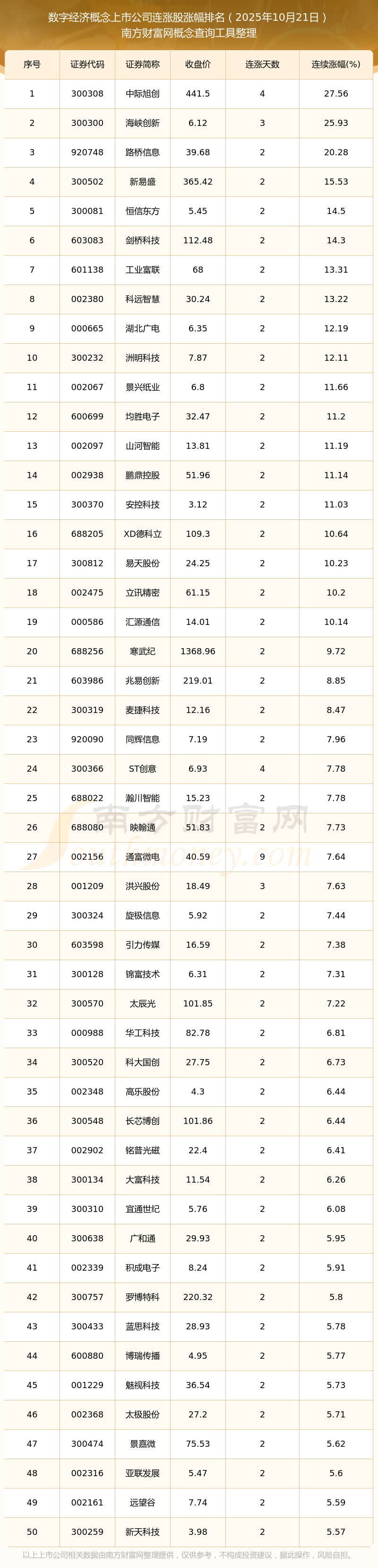 2025年10月21日數(shù)字經(jīng)濟概念上市公司連漲股漲幅排名
