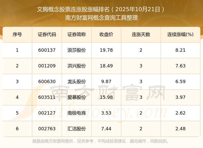 根據(jù)南方財(cái)富網(wǎng)概念查詢工具數(shù)據(jù)統(tǒng)計(jì),截止2025年10月21日收盤,文胸概念股票共有6只個(gè)股實(shí)現(xiàn)連漲。其中連續(xù)漲幅較大的個(gè)股有浪莎股份、洪興股份、龍頭股份等,連續(xù)漲幅分別為8.21%、7.63%、6.59%。