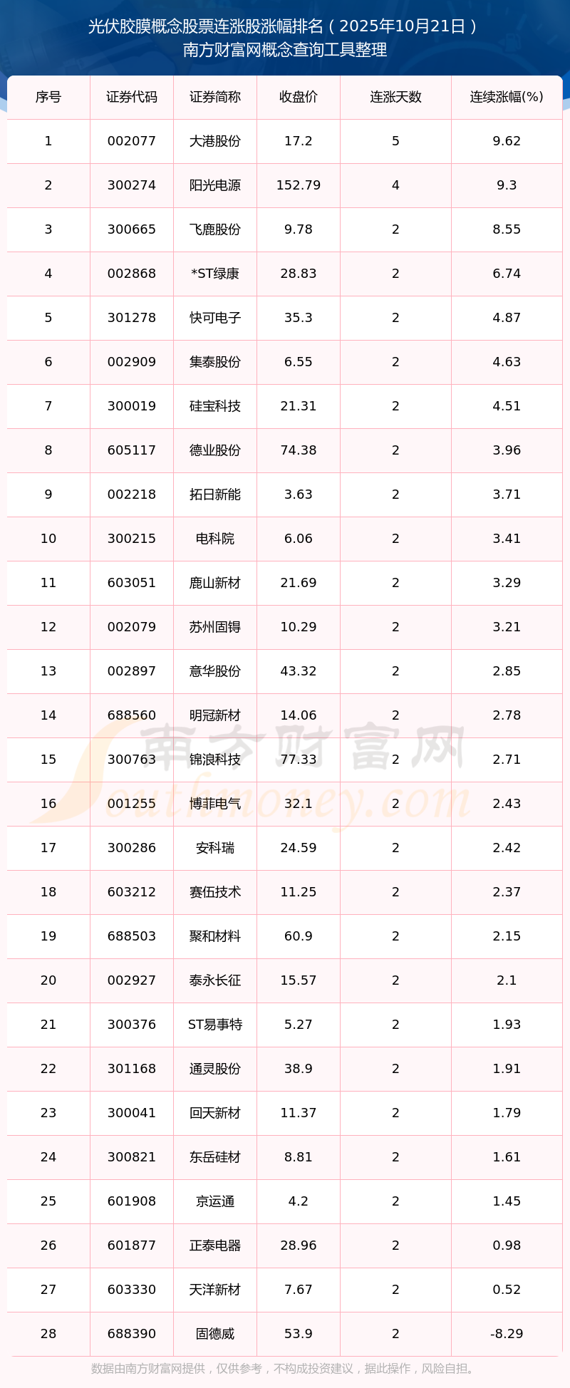 2025年10月21日光伏膠膜概念股票連漲股漲幅排名