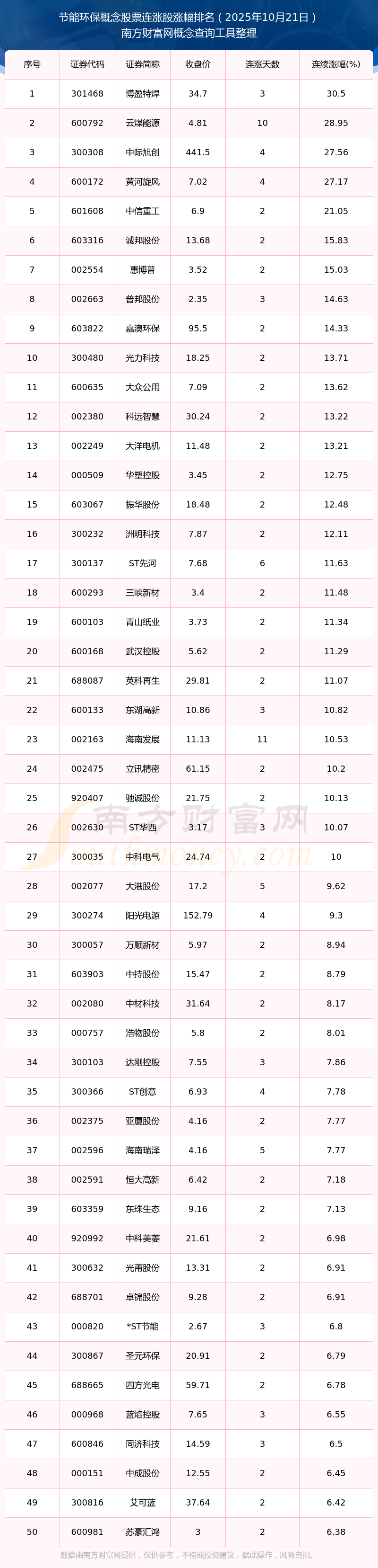 2025年10月21日節(jié)能環(huán)保概念股票連漲股漲幅排名