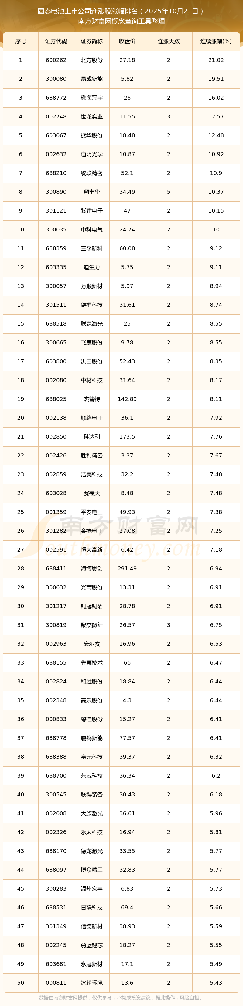 2025年10月21日固態(tài)電池上市公司連漲股漲幅排名