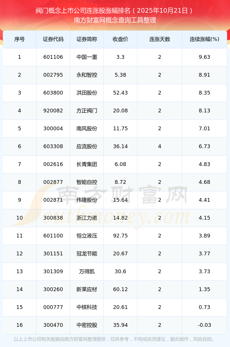 2025年10月21日閥門概念上市公司連漲股漲幅排名