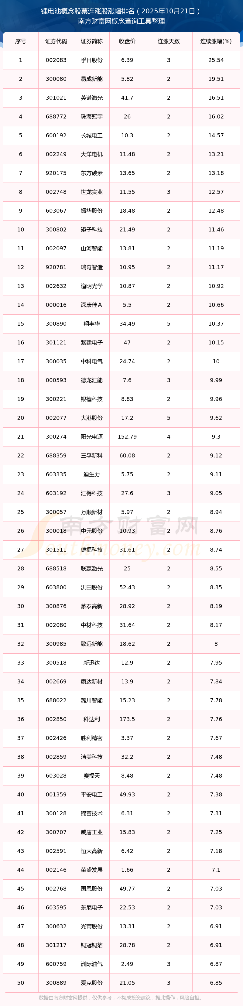 2025年10月21日鋰電池概念股票連漲股漲幅排名