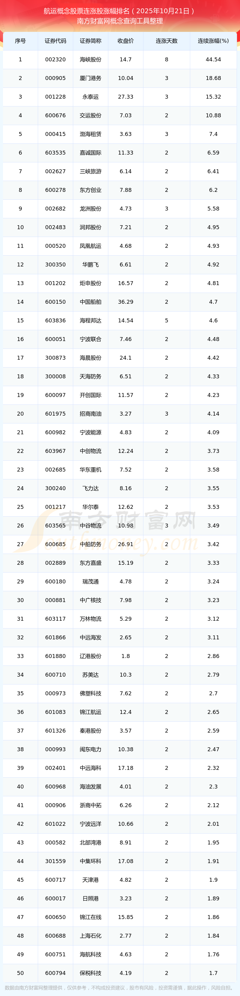 2025年10月21日航運(yùn)概念股票連漲股漲幅排名