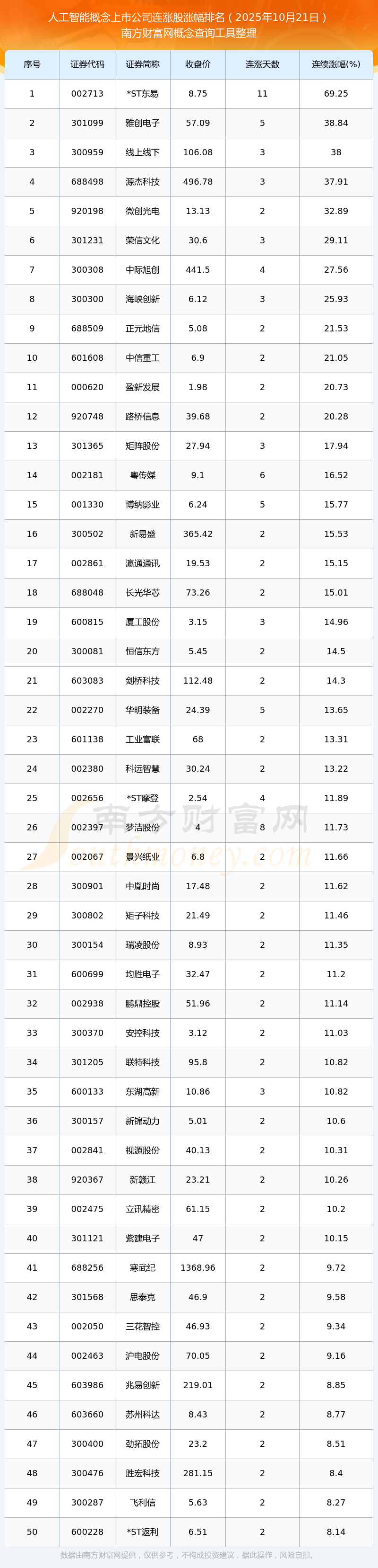 2025年10月21日人工智能概念上市公司連漲股漲幅排名