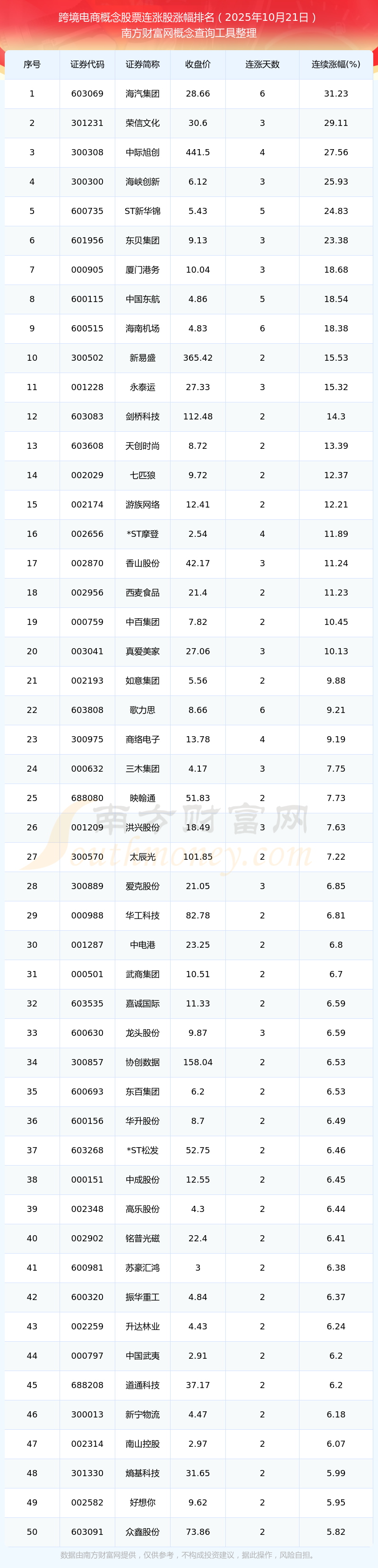 2025年10月21日跨境電商概念股票連漲股漲幅排名