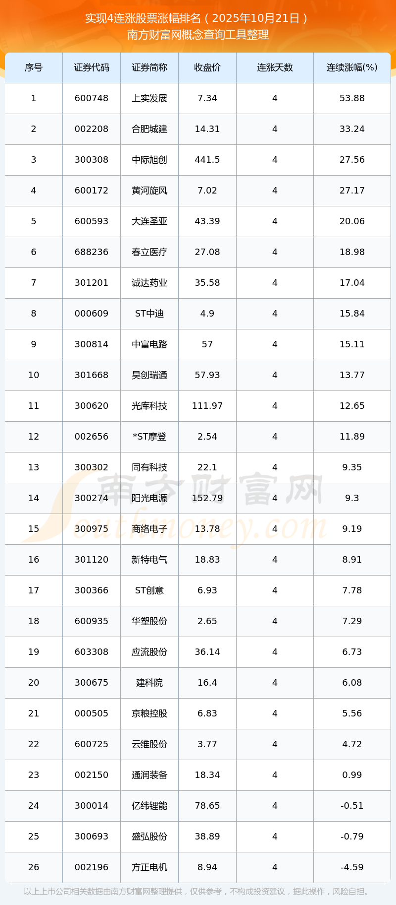 根據(jù)南方財(cái)富網(wǎng)概念查詢工具數(shù)據(jù)統(tǒng)計(jì),截止2025年10月21日收盤,共有26只個(gè)股實(shí)現(xiàn)4天連漲。其中連續(xù)漲幅較大的個(gè)股有上實(shí)發(fā)展、合肥城建、中際旭創(chuàng)等,連續(xù)漲幅分別為53.88%、33.24%、27.56%。