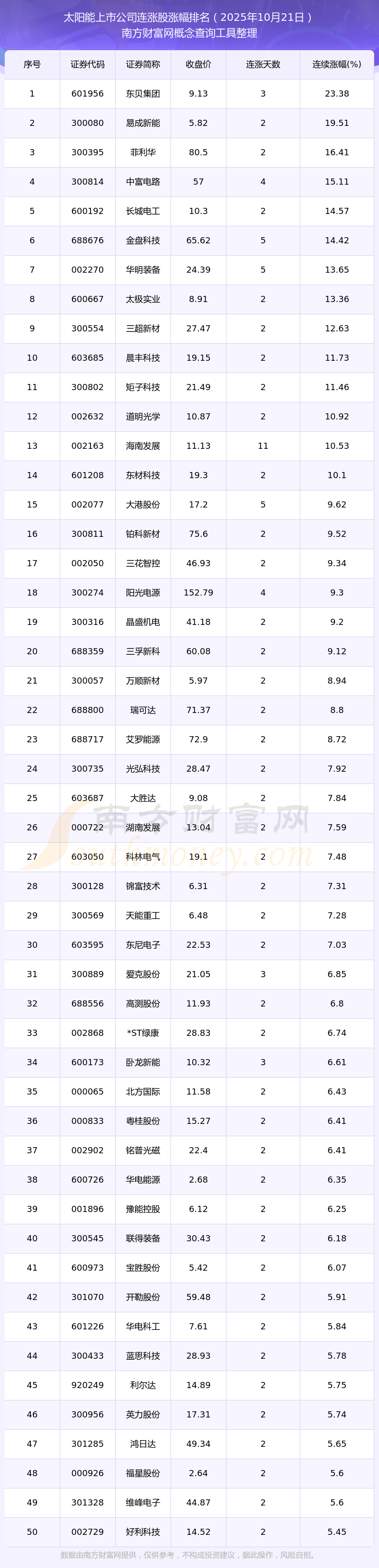 2025年10月21日太陽能上市公司連漲股漲幅排名